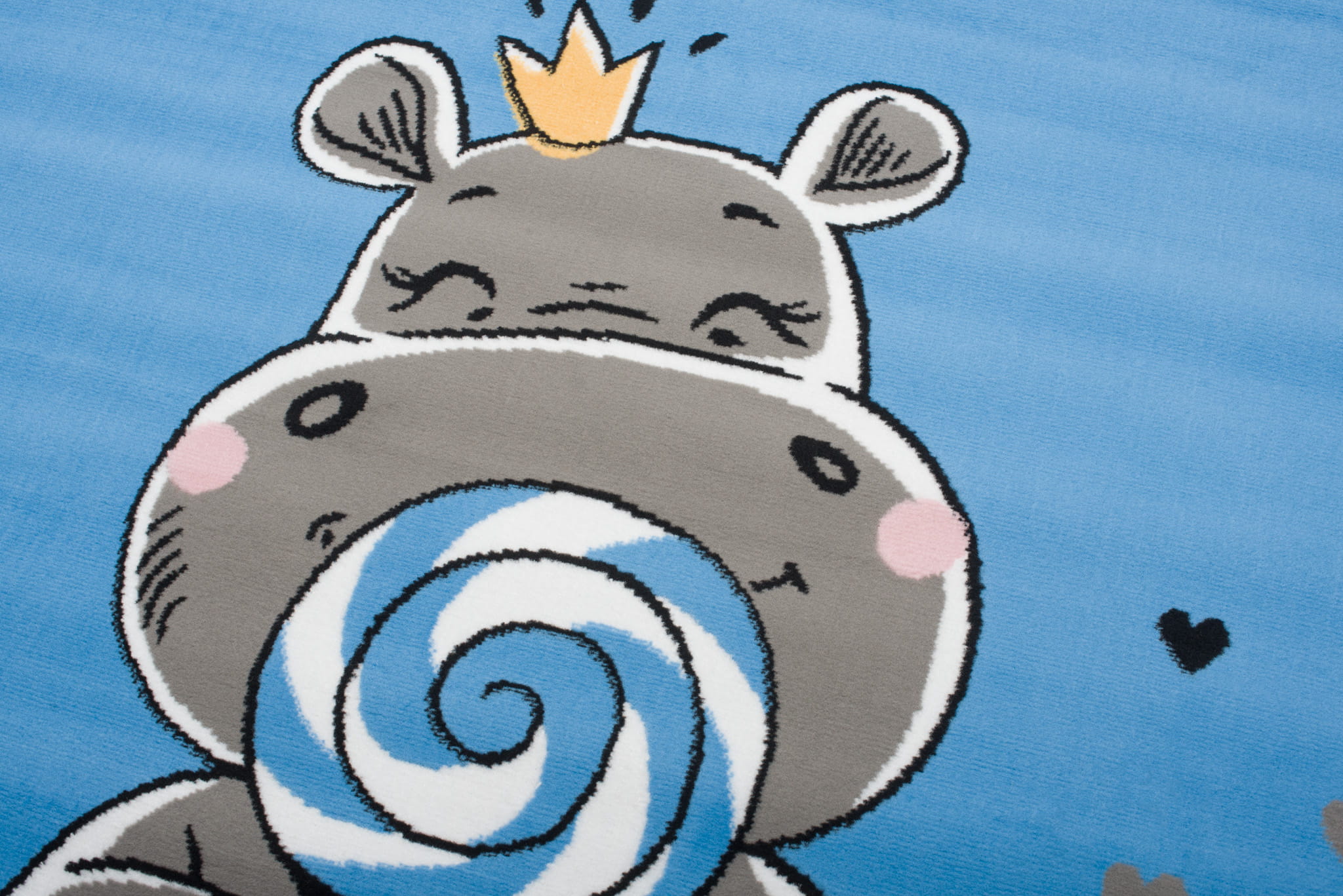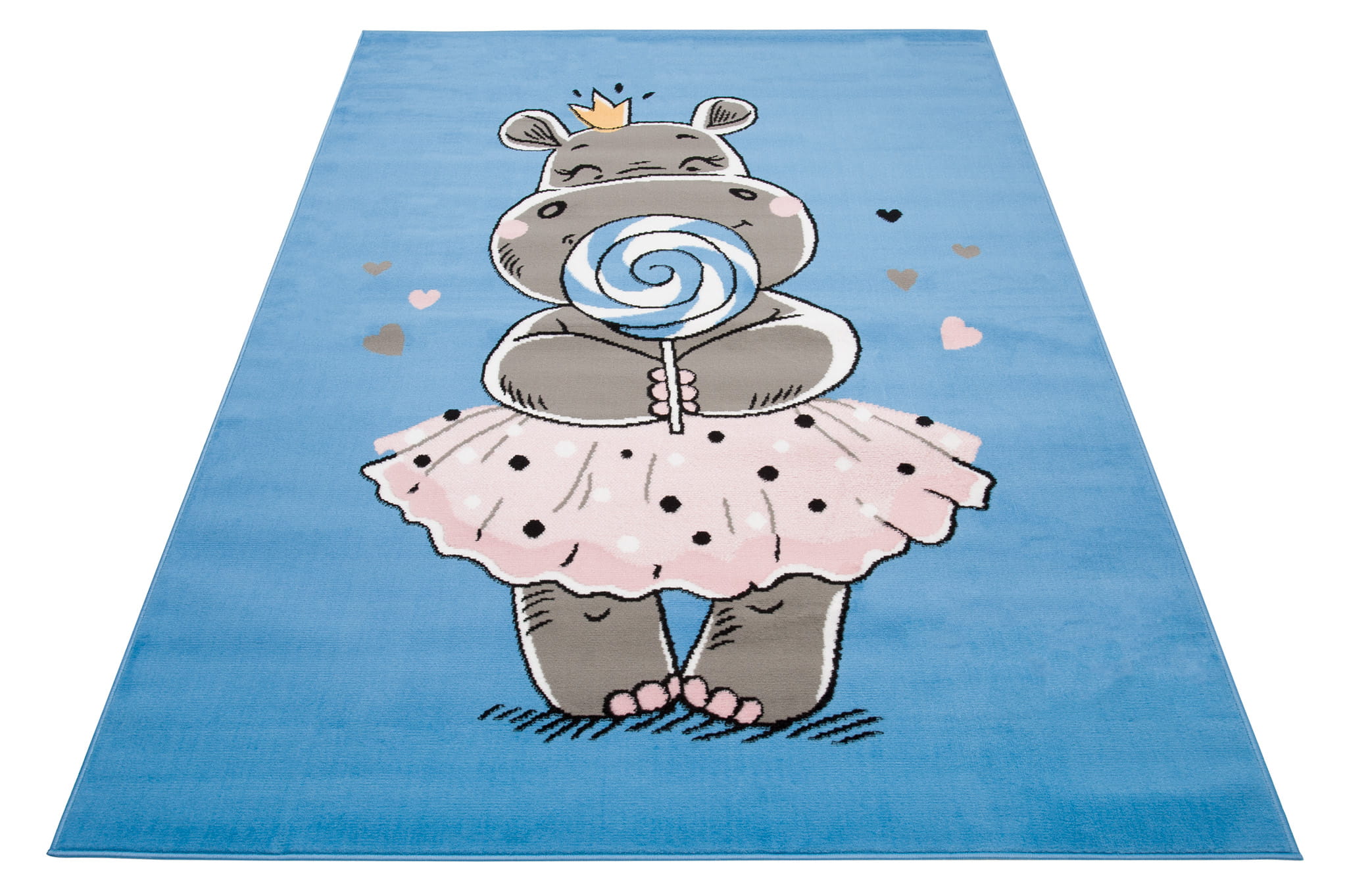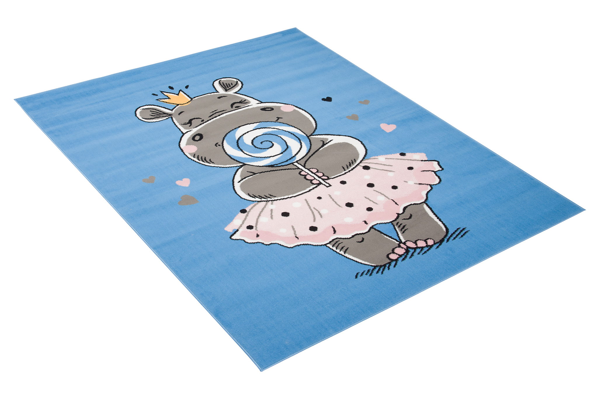 Dywan do Przedszkola KINDER HIPOPOTAM Niebieski to wyjątkowo uroczy i kolorowy akcent, który rozświetli każdą dziecięcą przestrzeń. Na tle w odcieniu nieba widnieje sympatyczny hipopotam w różowej spódniczce i z lizakiem w łapce – wzór, który wywoła uśmiech na twarzach najmłodszych i wprowadzi atmosferę beztroskiej zabawy.
