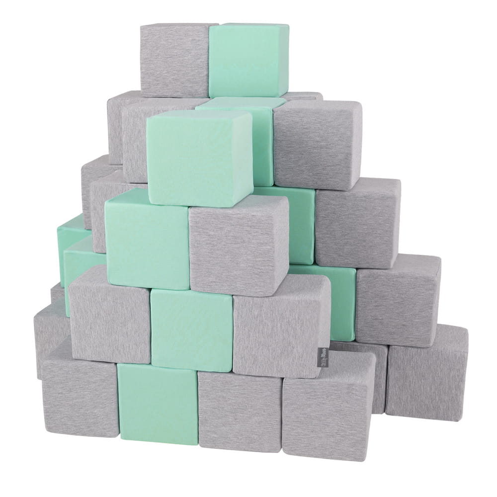 Zestaw zawiera: 48 miękkich sześcianów w kolorach jasnoszary i miętowy
